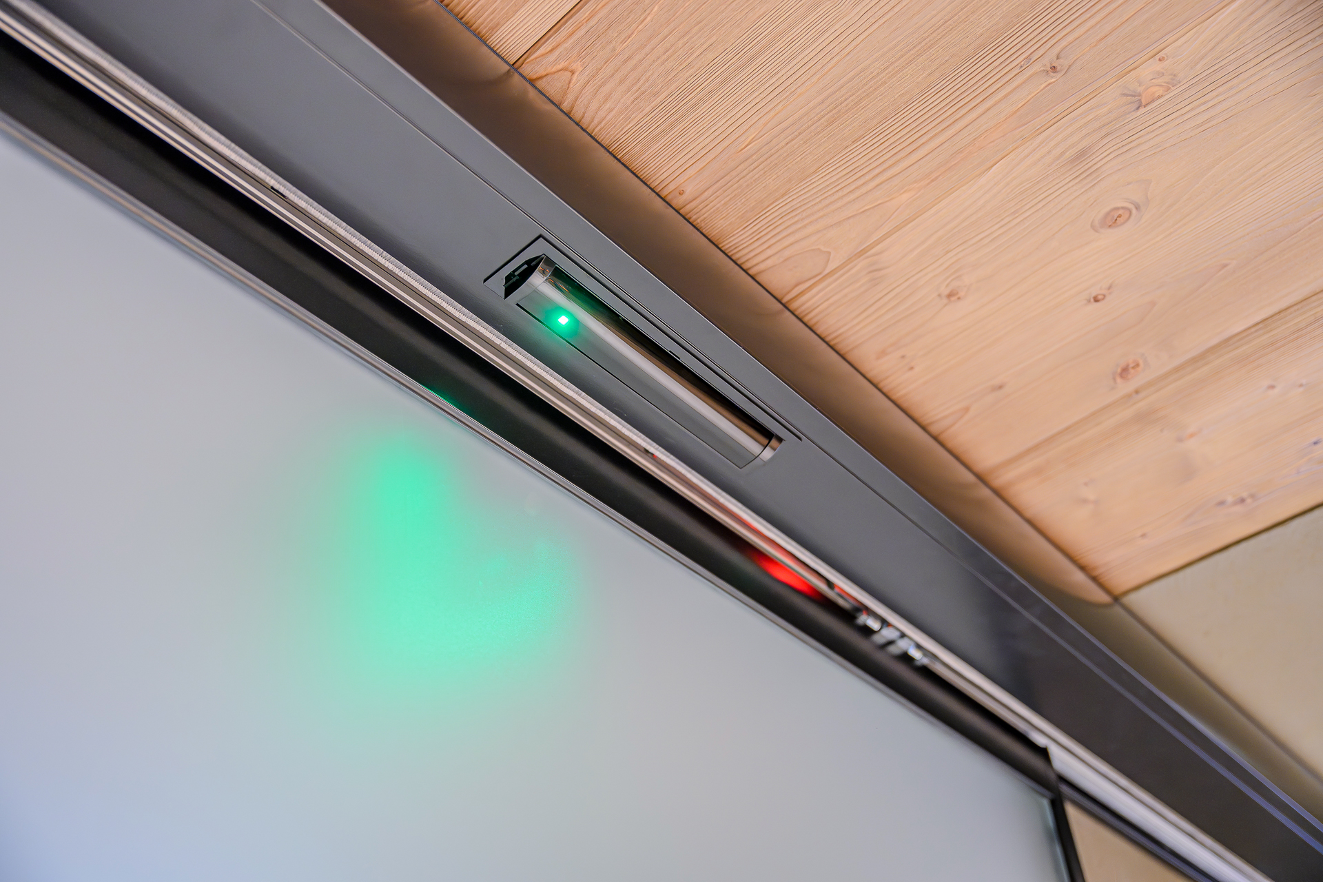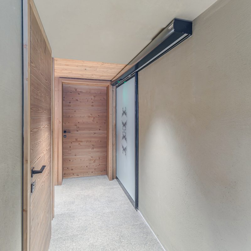 Automatic sliding doors 300 reflect this interior direction. They have a calm and subtle appearance with black contrast details, so they blend into the space while elevating it.